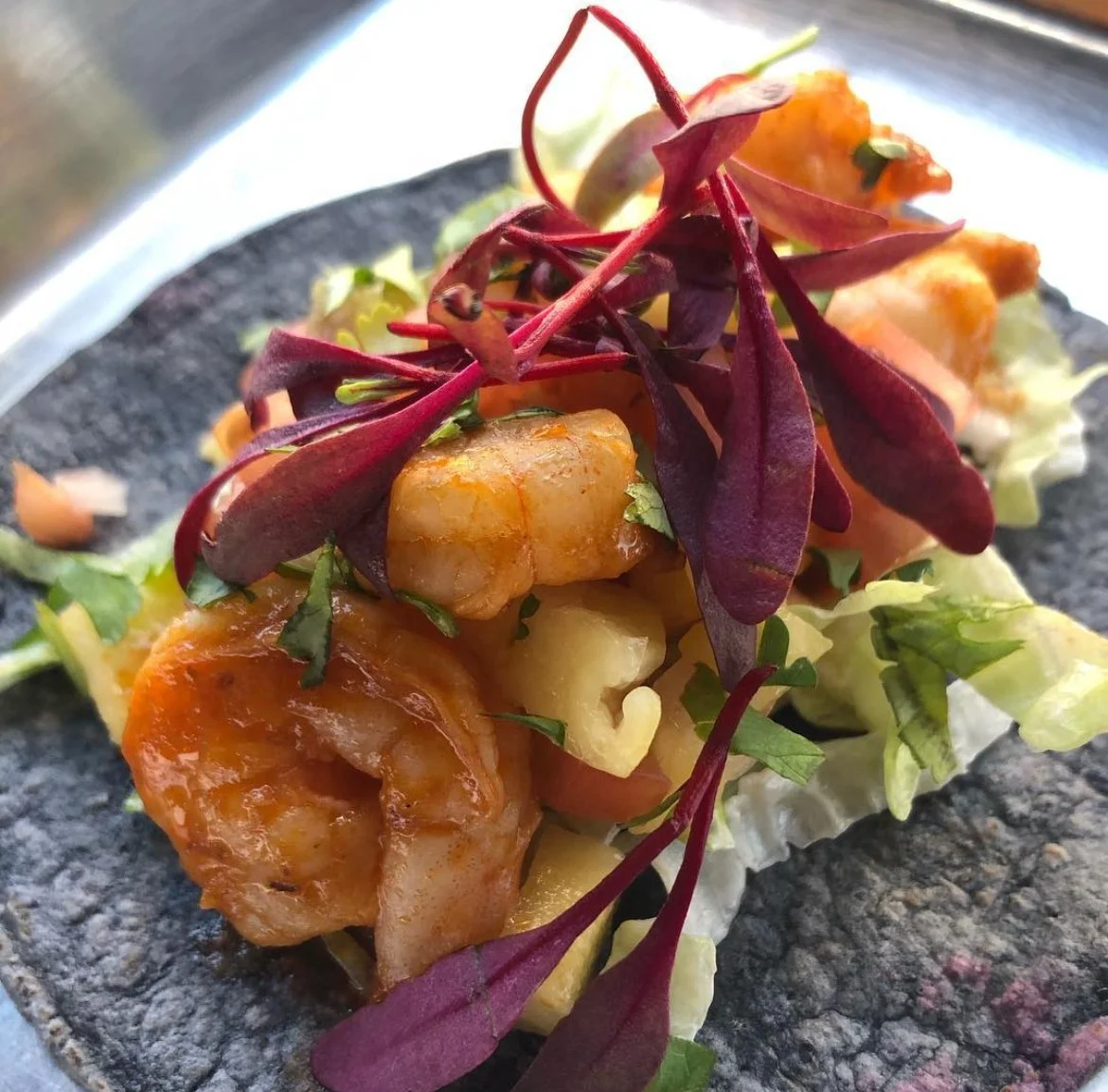 Shrimp Taco: Jicama shell with sautéed shrimp in garlic and tomatillos topped with cabbage